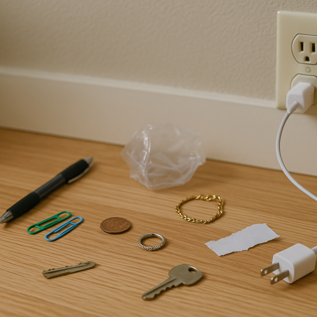 テーブルの上に置きっぱなしの薬、テレビ台のコード、リモコンのボタン電池、観葉植物の小石…。